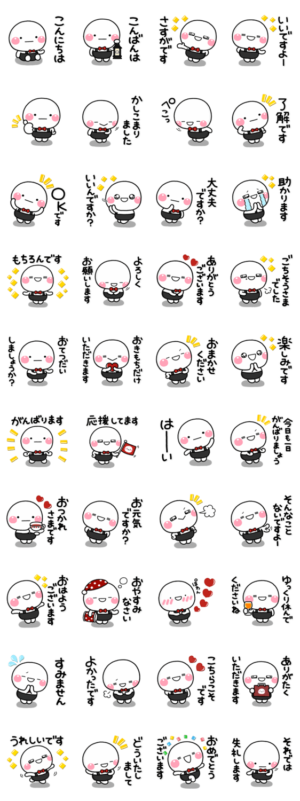 しろまるがおめかしした基本形スタンプです。ずっと使える内容を揃えましたのでスタンプ初心者の方にもオススメです。【作:いしいともこ】