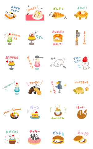 お菓子になりたいゆるくてかわいいどうぶつ達のスタンプです。おちゃめなイラストがもりだくさん。古川紙工株式会社 より発売