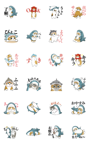 動くサメにゃんのスタンプです。にぎやかに動くスタンプをラインに飾ってトークを盛り上げましょう!