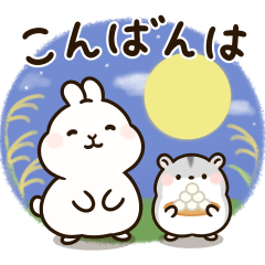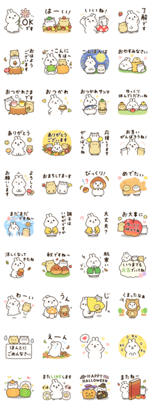 ぽっちゃりしたうさぎとハムスターの毎日使いやすい敬語入り、秋のスタンプです。(ハロウィン/お月見/挨拶)よつば より発売