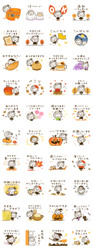 夏の終わりから秋にかけての日常に使える、ゆるボブGIRLのスタンプです♪文章は敬語です*。..気遣い/丁寧/大人かわいい/ボブヘア/女の子/紅葉/ハロウィン/フルーツ