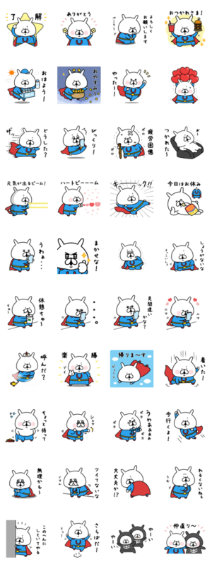 スーパーヒーローになったゆるうさぎのスタンプです。家族や友達、彼氏彼女、先輩後輩、ママ友...毎日のトークに添えてみてください。chococo より発売