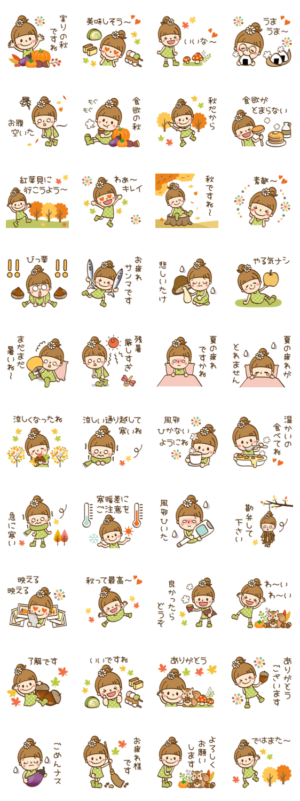 おだんごさんシリーズ。毎日使える・使いやすいスタンプです。可愛い・秋・ガール・おだんご・女の子・かわいい・9月・10月・11月・紅葉・だじゃれ遠藤まめこ より発売