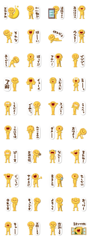 幸せを呼ぶ黄色い3Dスマイルマン。楽しいポーズでみんなを笑顔にしてくれます。毎日使える挨拶とリアクションいっぱい。takopon より発売