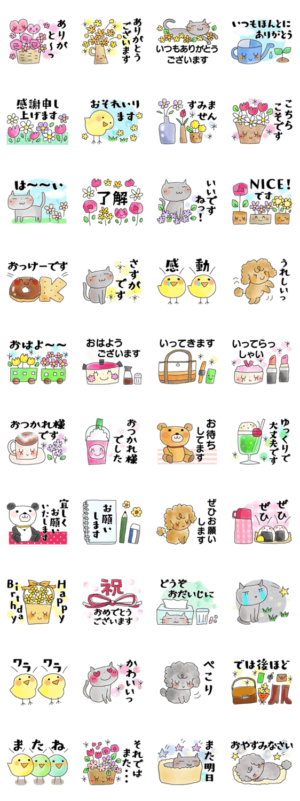 文字が大きくて見やすい、サクッと送れる40個。ほっこり優しい花いっぱいの気持ちが伝わるスタンプです。(毎日使える基本/挨拶/感謝/水彩/癒し/犬/鳥/大人かわいい/敬語)