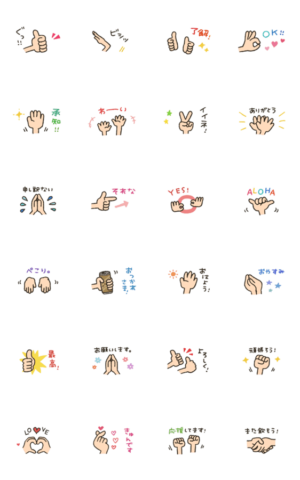 了解、ピース、握手、きゅんです、指ハート、OKサイン、グッ!手と指で作るハンドサインの動くスタンプです。横長省スペースなので会話を圧迫しない。男性も!