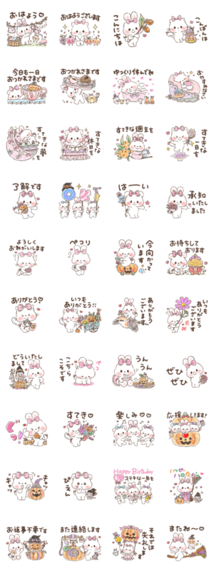 リボンギャルズ(うさぎりぼん、ねこりぼん、くまりぼん)秋の日常スタンプです。挨拶/敬語/ハロウィン/かぼちゃ/コスモス/黒猫/モズ/メルヘン/ファンシー/兎/猫/熊/水彩
