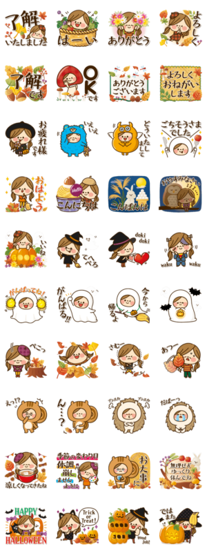 かわいい女の子の秋に使える楽しいスタンプです!おばけや魔女主婦がかわいくハロウィン気分を盛り上げます!