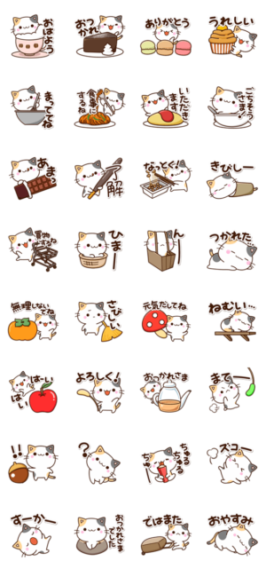 三毛猫の『ちびミケ』。スイーツや食事、秋の雰囲気のものまで幅広くそろえました。かわいい、みけねこスタンプ。ブチネコ好きの方にもぜひ。【かたこ】あいさつ・ハチワレかたこ より発売