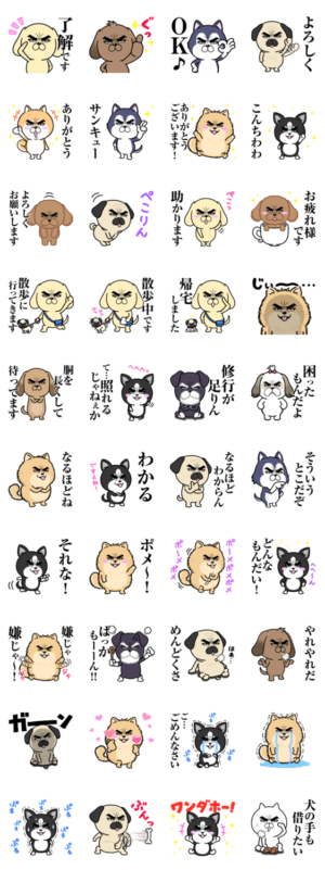 目ヂカラわんこの犬が大好きな人のためのイヌスタンプです。ポメラニアンやチワワなど色々な犬種が登場!目ヂカラにゃんこも友情出演。