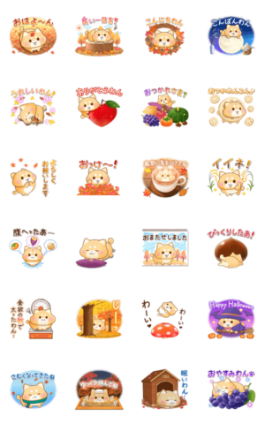 まんまるした柴犬の秋スタンプです!食欲の秋もたくさん食べてごろごろしています。マイペースに秋を過ごそう!すみれぐみ より発売