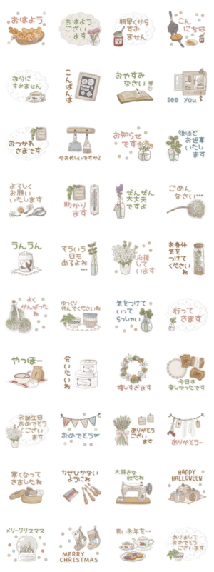 ナチュラルな雑貨のイラストです。敬語や挨拶も多く入った毎日使えるスタンプです。秋から冬、ハロウィンやクリスマス、お正月にも使っていただけます。(水彩スタンプ特集)