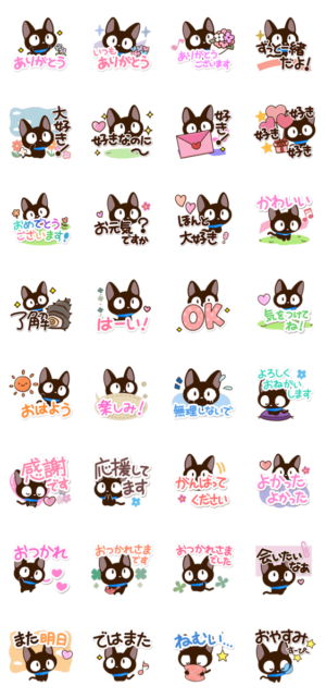 『やさしいクロネコ』の愛情いっぱいの黒猫スタンプ。かわいい便利なくろねこ。よく使う言葉や、毎日使うあいさつ等のくろねこスタンプ。【かたこ】ちいさい・楽しい
