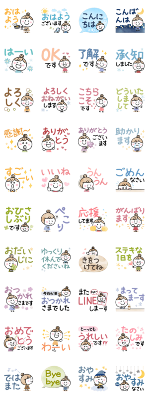 大きい文字で見やすい毎日使える敬語も入ったスタンプです。挨拶/日常/大人/女の子/女子/やさしい/お団子ヘア/水彩/デカ文字