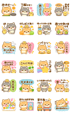 柴犬のまめちゃん&くろまめちゃんが画面いっぱい元気に飛び出して動くポップアップスタンプです。ぴよたぬき♡ より発売