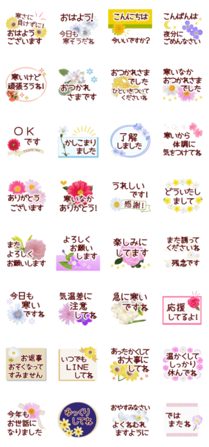 寒い冬だからこそ植物の癒し効果で華やかやわらかな印象のスタンプを。相手を思いやるさりげない気遣いの言葉が多いです。シンプルだから日常や仕事でも便利に使えます
