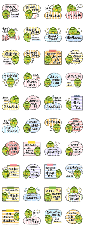 かっぱさんのスタンプ一つで返答が出来る大人の長文スタンプです。落ち着いたカラーで誰にでも送りやすく、毎日使える内容を厳選し作成しました。【作:いしいともこ】