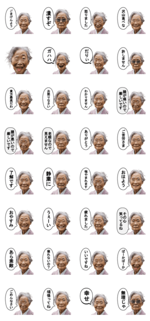 完全フィクションの人物です。毎日使える便利なおばあちゃんスタンプです。日常で使い勝手がいいです。面白い/ネタ/シュール/祖母/老人/女性/煽り/優しい/ジョーク/日本人