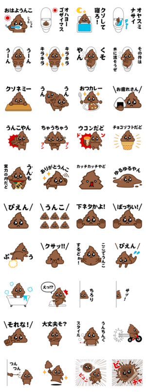 うんこ/ウンチ/うんこ/くそ/クソ/糞/まきぐそ/毎日使える/日常会話/笑顔/怒り顔/泣き顔/喜ぶ/使いやすい/スマイリー/にこちゃん/万能絵文字/大人向け/ピエン/ぱおん