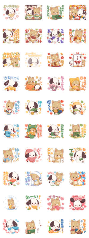 しば犬まろとまめ犬ころの冬スタンプです。大晦日やお正月など、年末年始、冬に使いやすい言葉やリアクションが沢山入っています。毎年使える便利なスタンプです!(あけおめスタンプ2024対象)