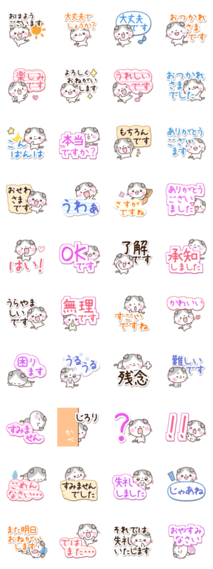 スコティッシュフォールド等のたれ耳ハチワレ猫スタンプです。グレーのかわいいぶちネコ。かわいい垂れ耳ねこ好きの方にぜひ。【かたこ】ブチ・保護猫・はちわれ・あいさつ