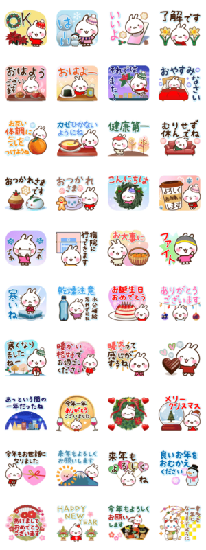 うさぎさんの冬の敬語入りの可愛い日常スタンプです♪ (クリスマス/年末年始/お正月/年賀状/あけましておめでとう/冬休み/誕生日/バレンタイン/気づかい/やさしい)