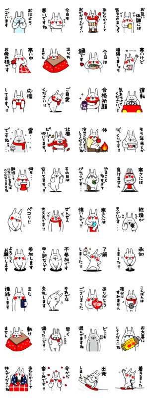 全力でうざい全力でおちょくるあざとかわいいウサギのお母さん・お父さん・ママ友・先輩・上司・年上にじじ・ばば・おじ・おばに使える冬の日常敬語スタンプ。年末年始用。cosotto より発売