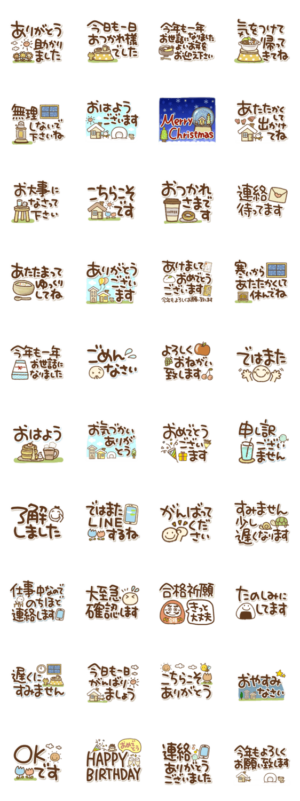 シンプルめなイラストで誰にでも送れる冬の気遣いスタンプです。日常会話やクリスマスや年末年始の挨拶もあります。