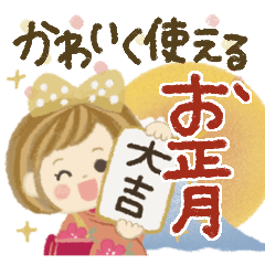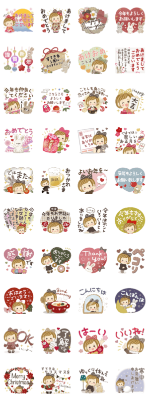 ボブヘアーの可愛い女の子のお正月年末年始に使いやすいスタンプです♪うさぎ/くま/ガール/花/年末年始