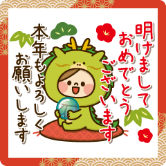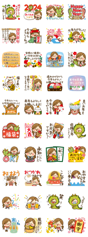 かわいい女の子の2024年賀など冬にたくさん使えるスタンプです。年末年始・新年の挨拶にぜひお使いください!辰年・龍(あけおめスタンプ2024対象)