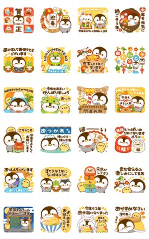 2024年を明るく彩る♡小さなペンギンの赤ちゃんぺんぺんが画面いっぱいに飛び出して動くポップアップスタンプです。辰ぺんぺんも登場♡年末年始/お正月/あけおめスタンプ(あけおめスタンプ2024対象)ぴよたぬき♡ より発売