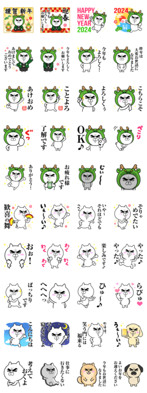 目ヂカラにゃんこの2024年辰年のお正月・年末年始スタンプです。日常使いできるスタンプも多数入っています。(あけおめスタンプ2024対象)