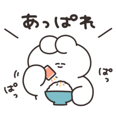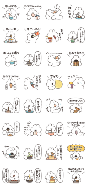 ごはんを食べながら煽るうさぎのスタンプです。ナポリ より発売