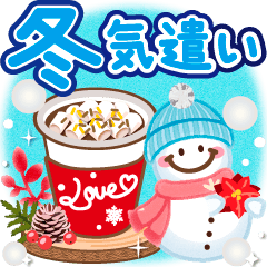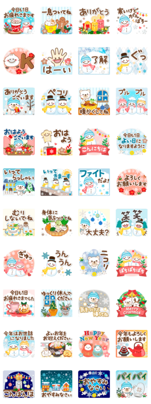 冬の雑貨や雪の結晶がおしゃれでキラキラした感じに仕上げました。大文字の挨拶スタンプで気遣い言葉が多めです。雪だるまや白くまがいます。年末年始やクリスマスにも。