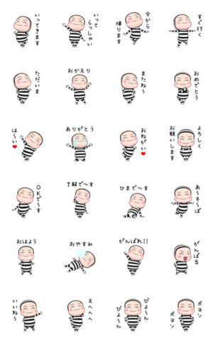 大人かわいい囚人の全身タイツちゃんのスタンプです。挨拶やお礼など日常よく使う言葉を集めました。家族や友達との連絡にどうぞ。