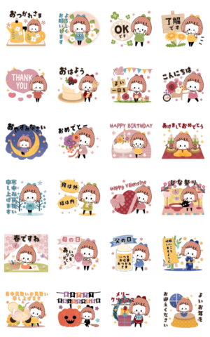 可愛いリボンガールの一年中使えるイベントスタンプです。 毎日の挨拶から季節ごとに使えるスタンプセットです。NAKAYUKA より発売