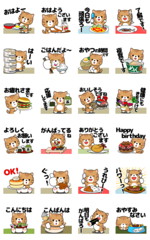 茶トラ猫の飛び出すスタンプです。おいしそうな食べ物を集めました。ヒサケイプリン より発売