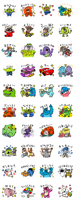 手書き風のかわいいスタンプ。ピクサーのキャラクター大集合でかわいい!