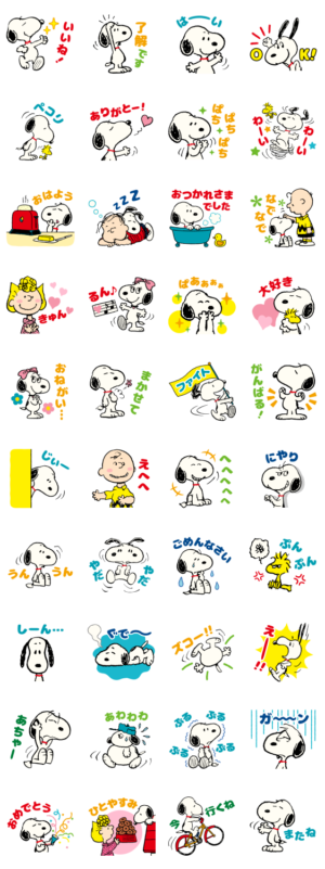 使いやすい言葉を集めたスヌーピーの「文字あり」スタンプが登場!喜怒哀楽の表現豊かなラインナップです。シンプルな「文字なし」版もあるよ♪