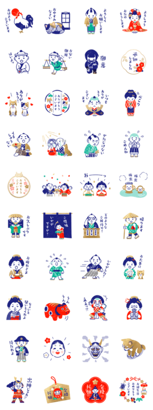 日常の挨拶と、日常で使う(かもしれない)和の言葉のスタンプです。 和風/敬語/着物/舞妓/侍/忍者/寿司職人/歌舞伎/柴犬/三毛猫/福助/お多福/般若/合格祈願/誕生日CADRE より発売