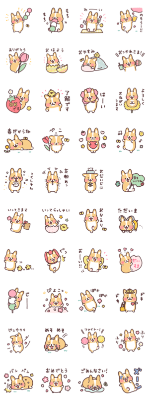 カラフルな春仕様になって、コーギーが桜やお団子を楽しみます♪毎日の挨拶からいろんなシーンで使えるスタンプです。つじなつみ より発売