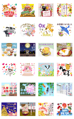誕生日やお正月などの挨拶などに使えるスタンプで重宝しそうです。