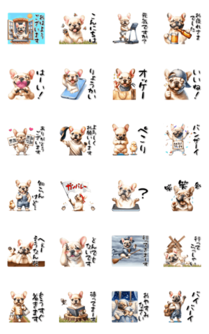 「おはようからおやすみまで、フレンチブルドッグの可愛さで一日を彩りませんか?フレブルさんの挨拶スタンプで、あなたのメッセージをもっと特別なものにしましょう!」Masajii より発売