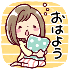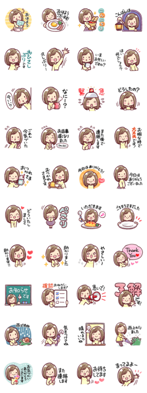 ボブヘアの娘、水彩タッチの挨拶&お返事スタンプ。日常のやりとりに便利な言葉を揃えました。