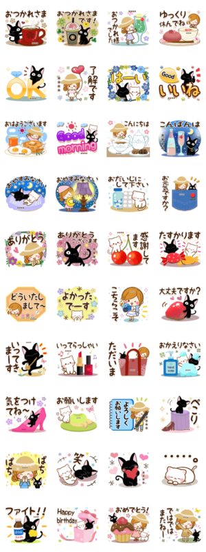 かわいい白猫と黒猫&かわいい女の子の癒される日常名前(カスタム)スタンプです☆よく使う言葉を厳選しています(☆こちらは以前発売したスタンプのカスタム再編集版です)