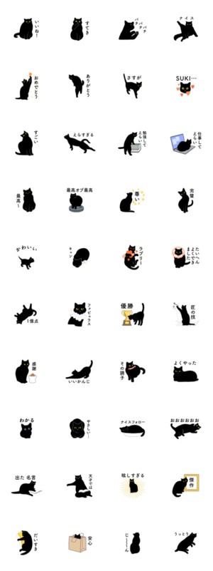 黒猫がいろいろと褒めてくれるスタンプです。丹地陽子 より発売