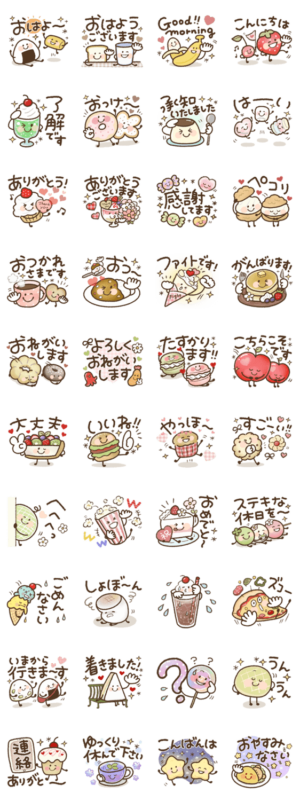 毎日使いやすい挨拶やリアクションがいっぱい入った便利なスタンプです♪可愛い食べ物が大活躍♡/スイーツ/パン/おにぎり/シンプル/丁寧/見やすい/文字大きめ