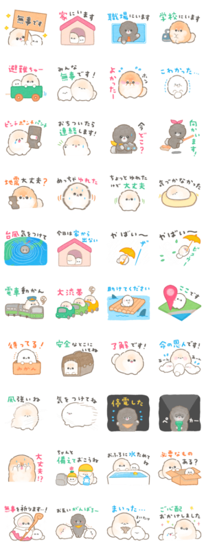 ポメラニアンぽぽち・ぱぴちの防災・災害スタンプ。地震・台風・大雨などの緊急時の連絡に使えます。ぽこ より発売
