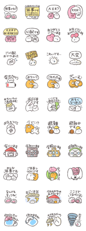 自然災害や緊急連絡に相手を気遣う防災スタンプです! 大雨/豪雨/台風/地震/津波もくもくちゃん より発売