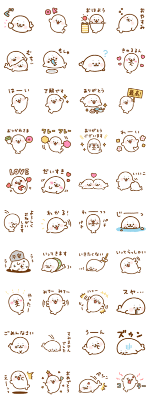 ふわふわむちむちなあざらしのスタンプ第3弾です!手書きタッチのゆるくてころんとしたゴマフアザラシに癒されてください!つじなつみ より発売